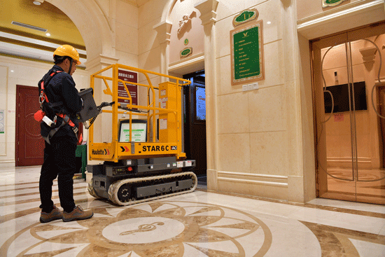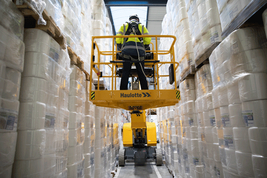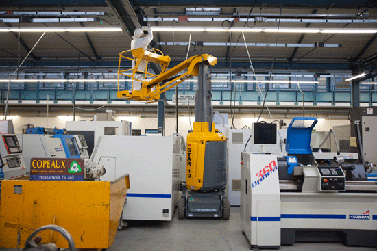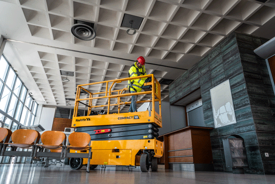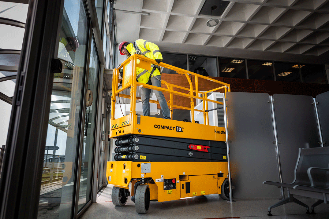 Plataformas tesoura compactas ou plataformas de mastro são excelentes escolhas para espaços estreitos. Seu tamanho reduzido facilita a manobrabilidade em áreas limitadas. Na linha COMPACT da Haulotte, é possível dobrar os guarda-corpos para passar por portas baixas, um recurso bastante prático para trabalhos internos com aplicações específicas.